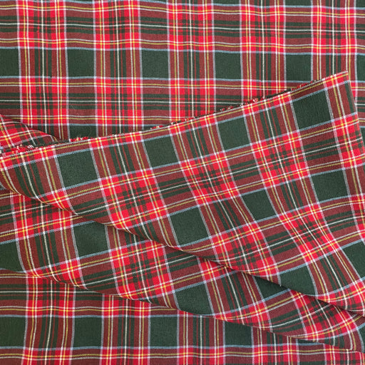 Scopri il fascino senza tempo del Tessuto Tartan Scozzese Rosso a Motivo Piccolo. Con il suo classico disegno a quadri rossi, verdi, gialli e bianc...