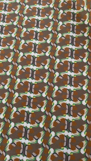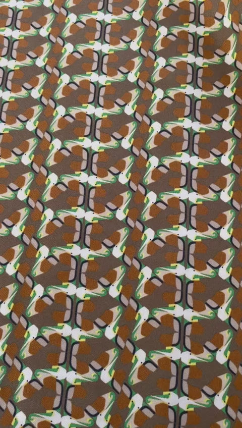 Il Tessuto Viscosa Gabardine Fantasia Geometrica è un tessuto in viscosa con trama gabardine, alto 140 cm. Questo tessuto presenta una vivace fantasia geometrica nei toni del marrone, verde e bianco, ideale per creare capi di abbigliamento unici e alla moda.