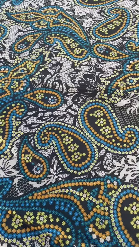 Il Tessuto Rasetto Paisley Floreale è un raso 100% poliestere, con un finish lucido e liscio. Questo tessuto, alto 150 cm, presenta una raffinata fantasia paisley con piccoli fiori gialli, blu e verdi su sfondo nero e bianco.